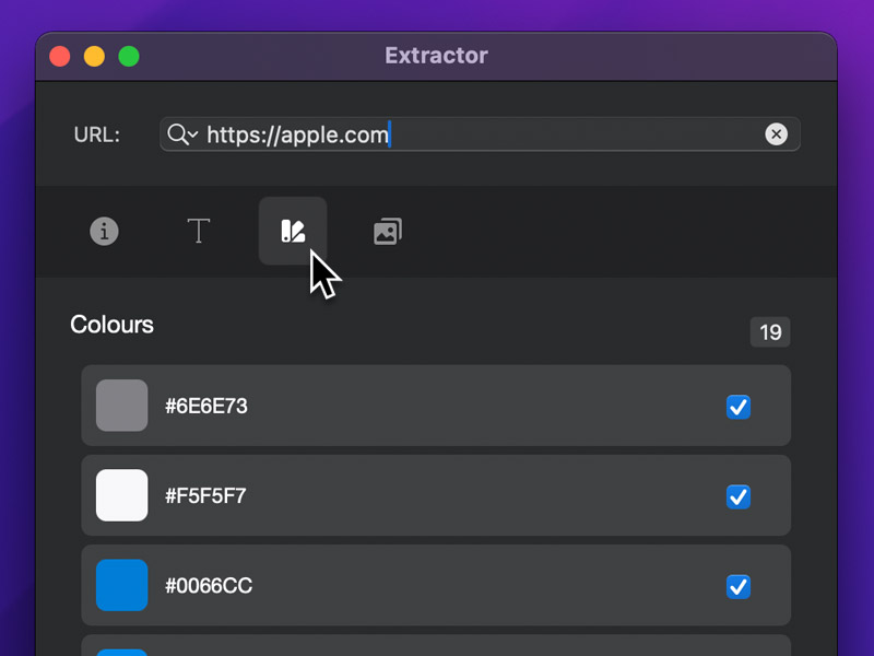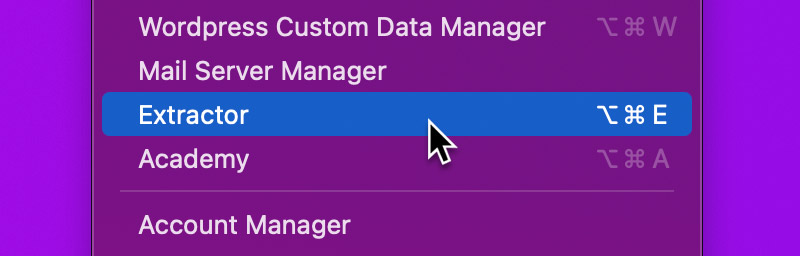 To launch the Extractor, head up to the Main Menu Bar and from the Windows menu, select Extractor or alternatively use the keyboard shortcut ⌥⌘E.