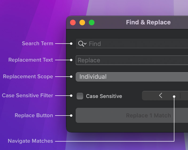 The Find and Replace window provides a range of controls that let you search for text, filter results, and customise how replacements are applied.