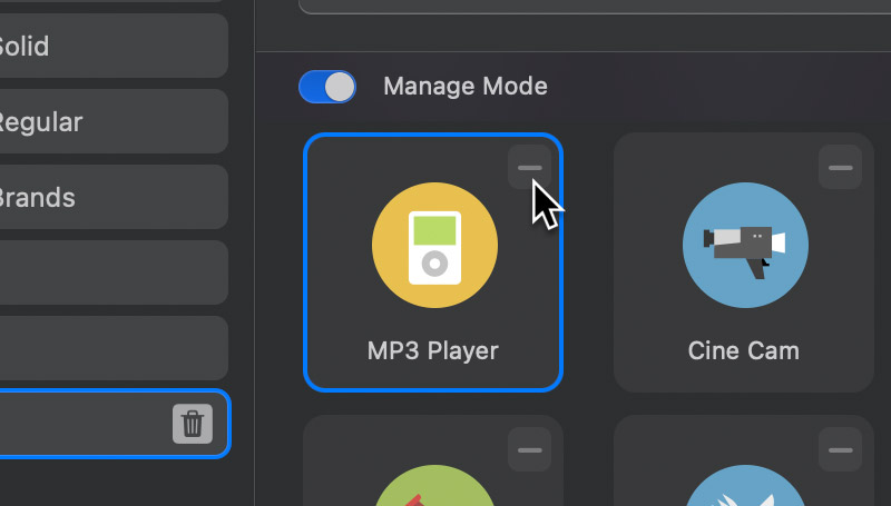 When Manage Mode is enabled, selections won’t be applied to the currently selected element on the design canvas. This makes it easier to reorder and drag icons into sets.